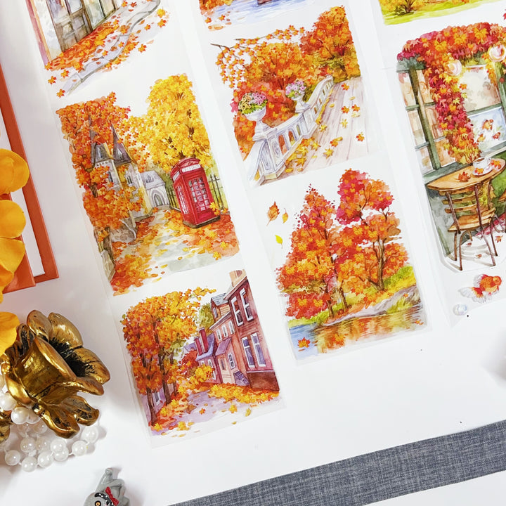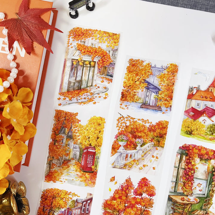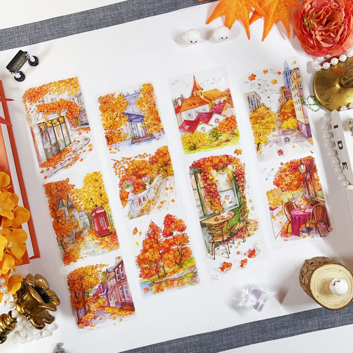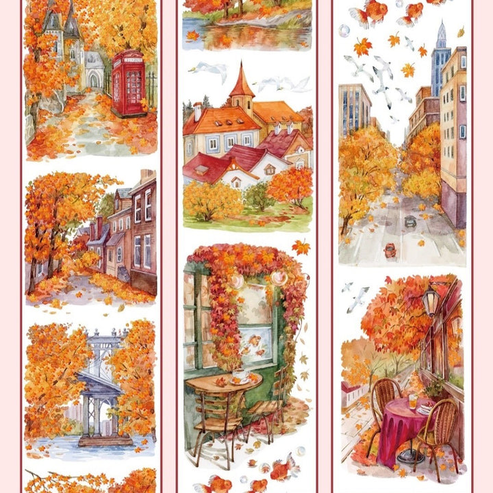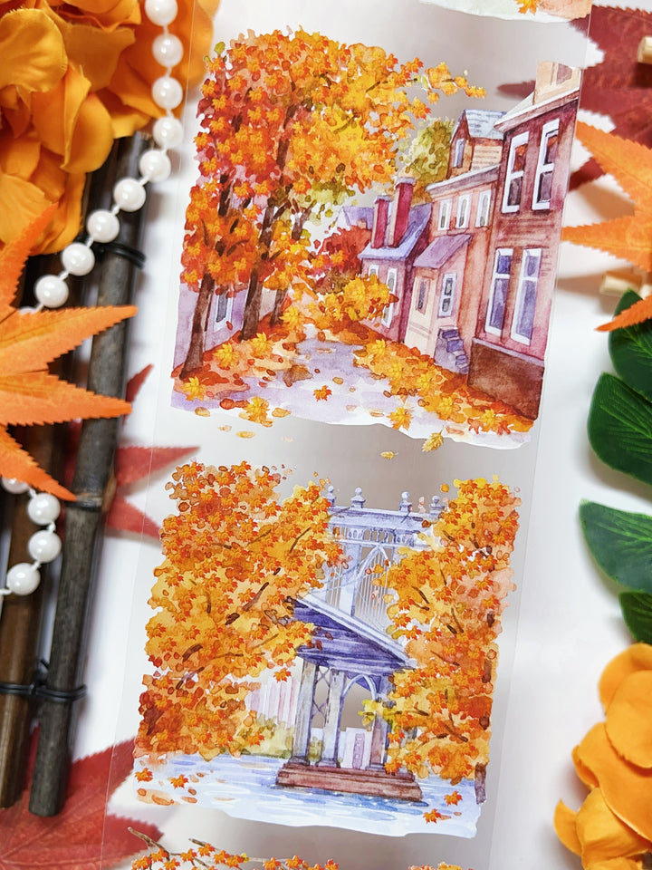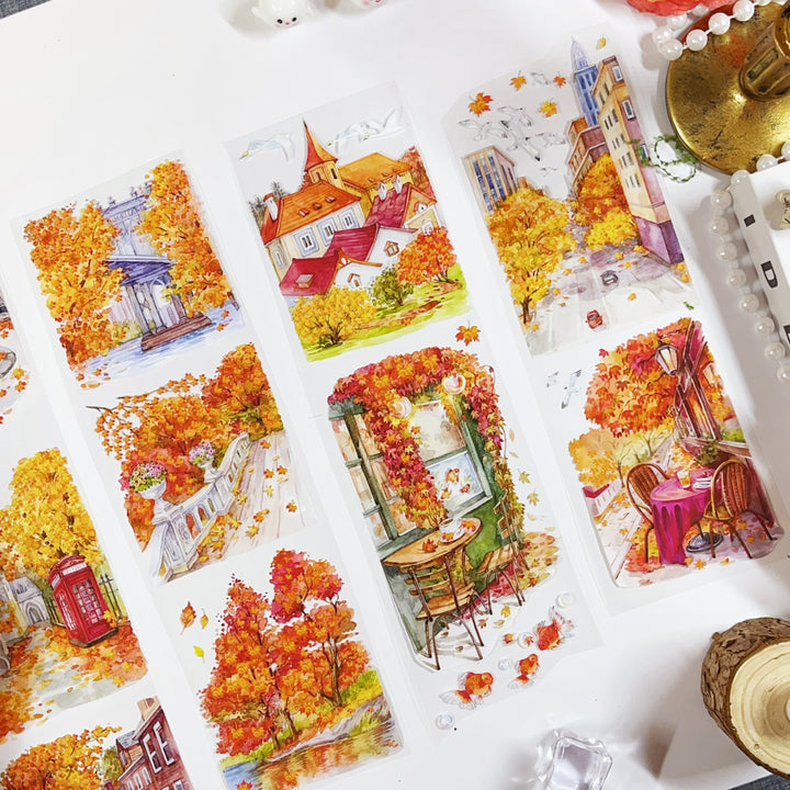 Autumn Street Corner PET Scenery Tape features cozy autumn street elements, making it perfect for scrapbooking, journal decorating, scenery building, and card making.