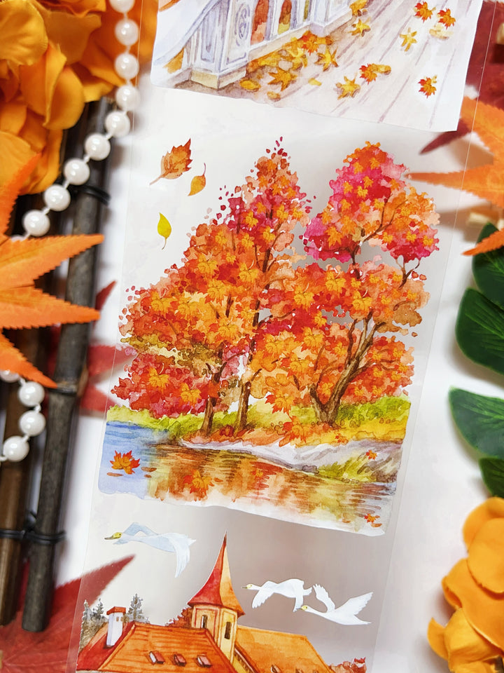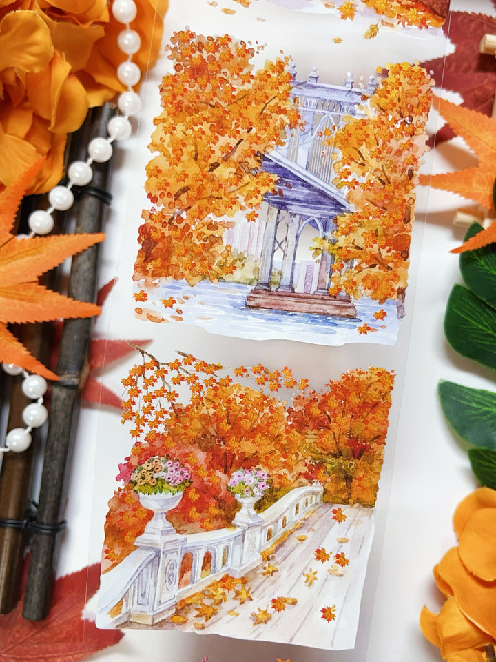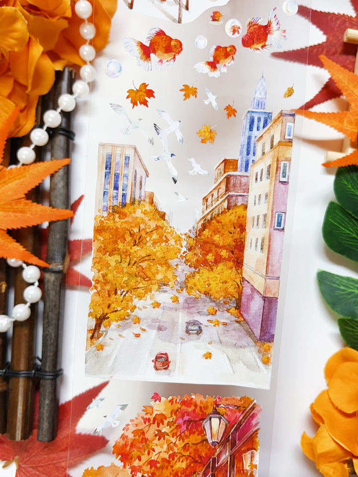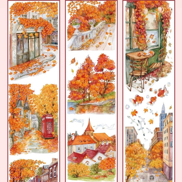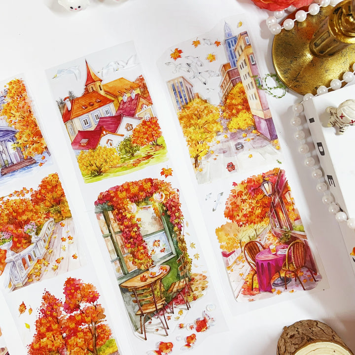 Autumn Street Corner PET Scenery Tape features cozy autumn street elements, making it perfect for scrapbooking, journal decorating, scenery building, and card making.