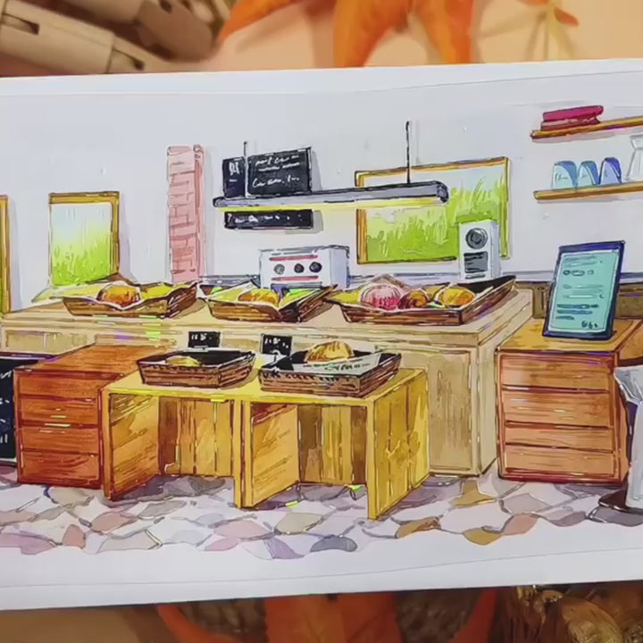 The Bakery Workshop Scene PET Tape features charming miniature bakery furniture and cozy workshop details, making it perfect for scrapbook and journal projects, scene building, collage backgrounds, and card making.