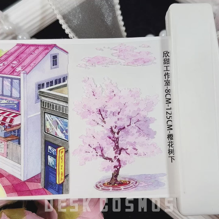 This scenic tape is centered on cherry blossoms and features a charming small-town landscape with trams, empty roads, street corners, newsstands, and little shops, full of everyday life charm. It is perfect for creating layered scenes in scenic journaling and handcraft projects.
