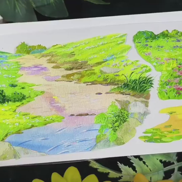 The Creekside Nature Scene PET Tape showcases tranquil creekside landscapes and natural details, making it perfect for scrapbook and journal creation, scene building, collage backgrounds, and card making.