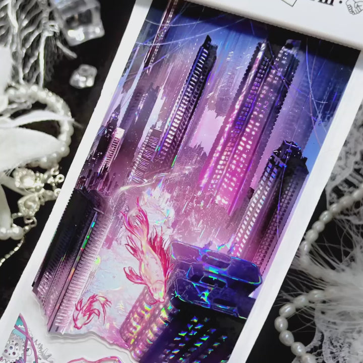 This city-themed tape features a cyberpunk style with elements of apocalyptic invasion, wasteland landscapes, and last fortresses. It includes motifs such as Cthulhu invasions and mechanical eyeballs, making it perfect for creating cyberpunk or futuristic magic-themed journals.