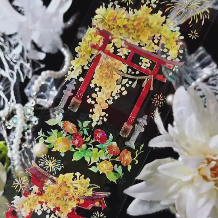 The Japanese Fireworks Scene PET Tape features vibrant fireworks over serene Japanese nightscapes, making it ideal for scrapbook and journal projects, scene building, collage backgrounds, and card making.