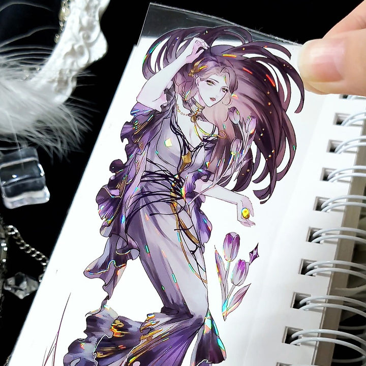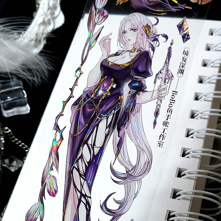This "Purple Witch Gothic Style Character PET Tape" includes purple witch character illustrations and gothic motifs, making it ideal for scrapbook and journal creation, diorama scene design, and card making.