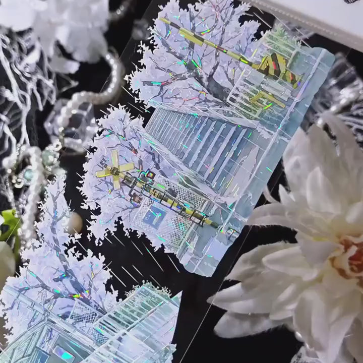 The Rainy Street Scene PET Tape features atmospheric rainy street visuals with layered urban scenery, making it ideal for scrapbook and journal creation, scene building, collage backgrounds, and card making.