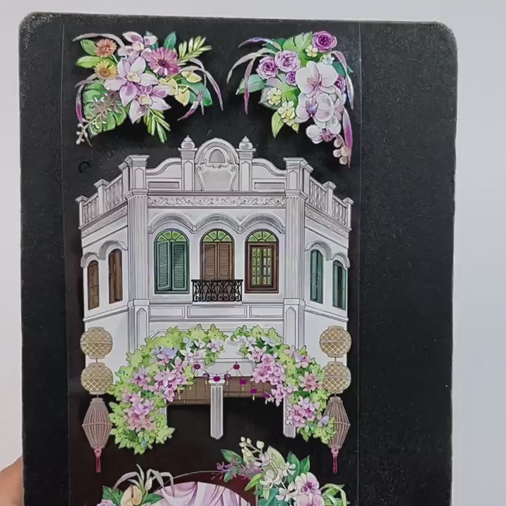 This is an architecture-themed PET tape featuring a Southeast Asian luxury mansion design. It is ideal for use in scene-building collage journaling and creative scrapbook layouts. The main elements include East Asian-style furniture, wooden staircases, attics, and other architectural details.